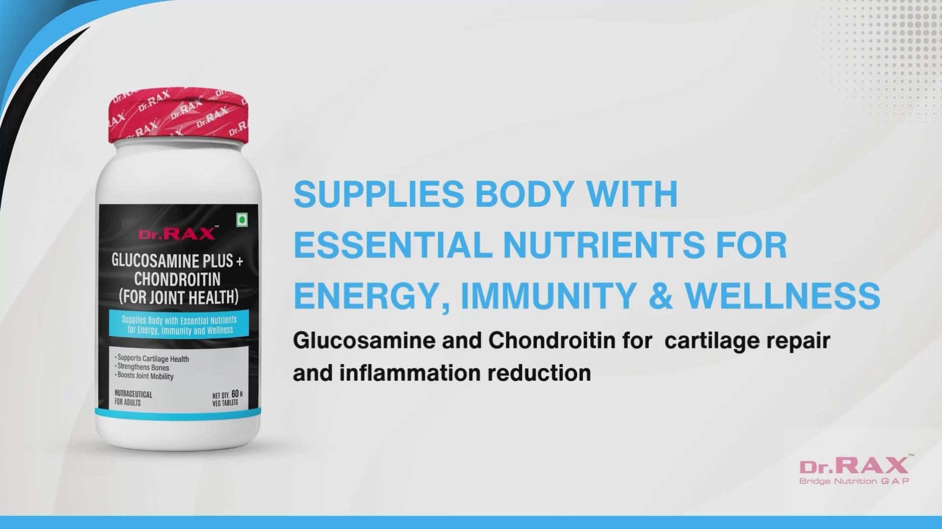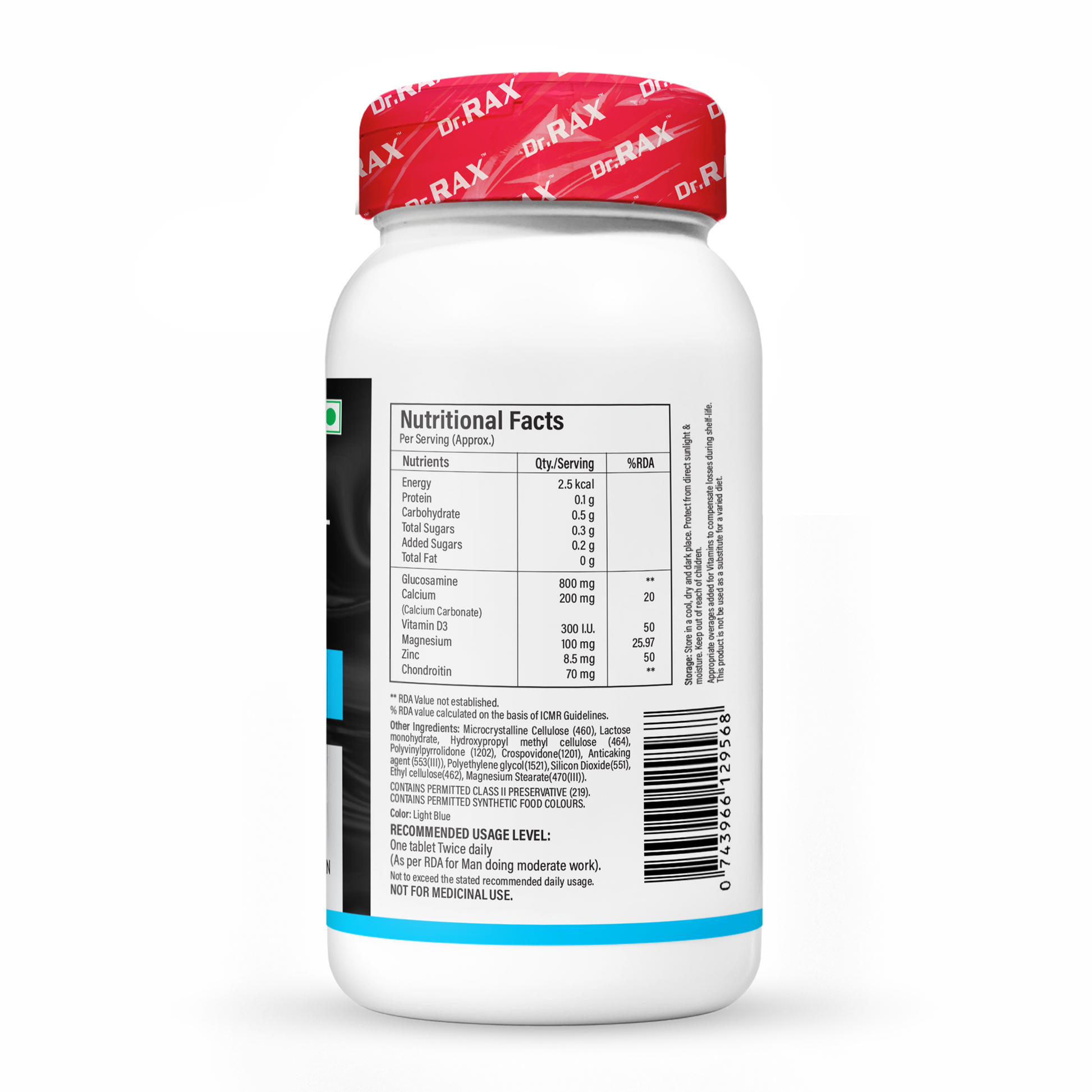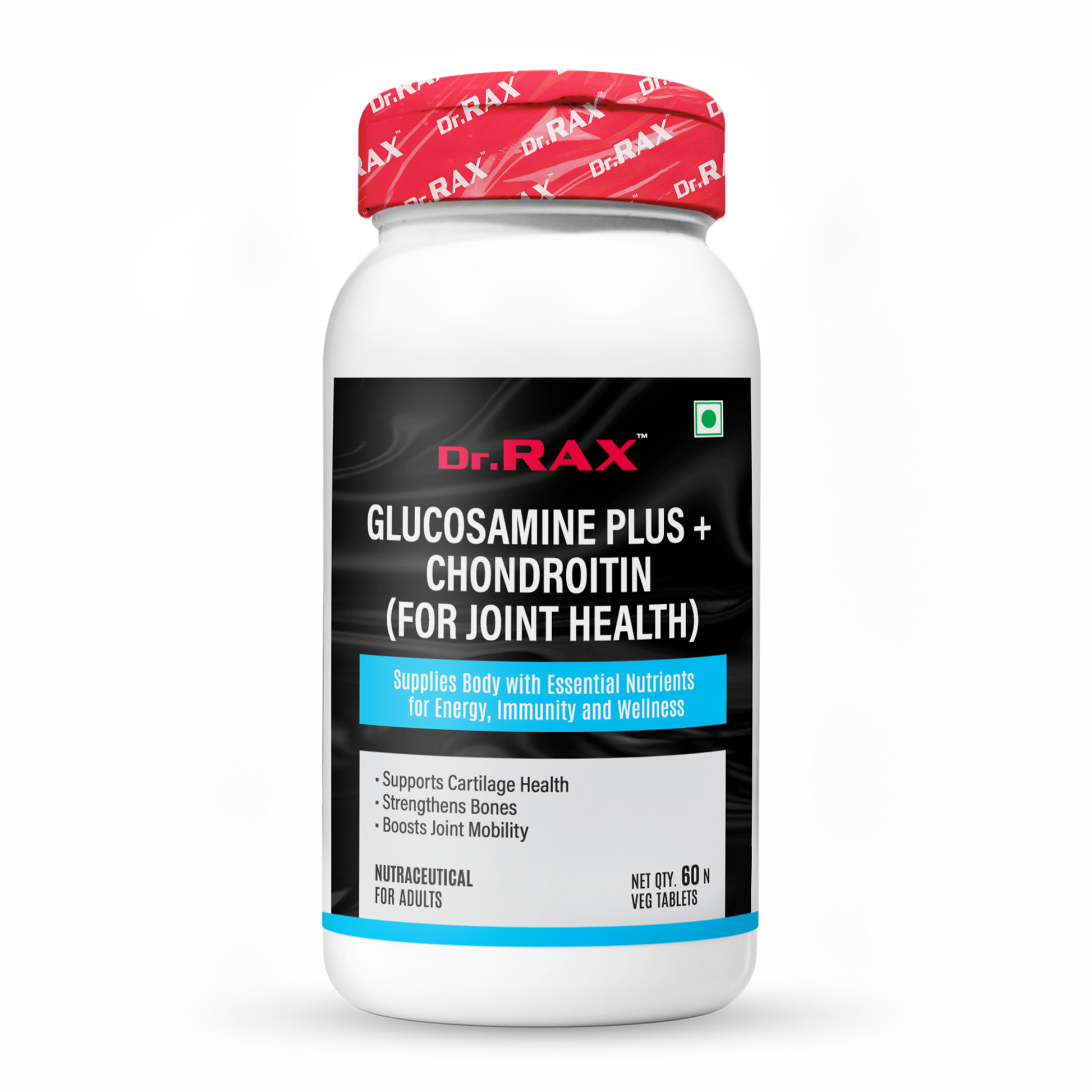Dr. Rax Glucosamine Plus + Chondroitin (for Joint Health) Veg Tablet is a scientifically formulated nutraceutical supplement that may help to support joint health, bone strength, and cartilage integrity. It supplies the body with essential nutrients for overall well-being, immunity, and energy. This supplement is enriched with glucosamine and chondroitin, which may play a crucial role in maintaining joint flexibility and mobility. It also contains key minerals and vitamins that may contribute to improved calcium absorption, bone density, and muscle function.- Glucosamine – 800 mg