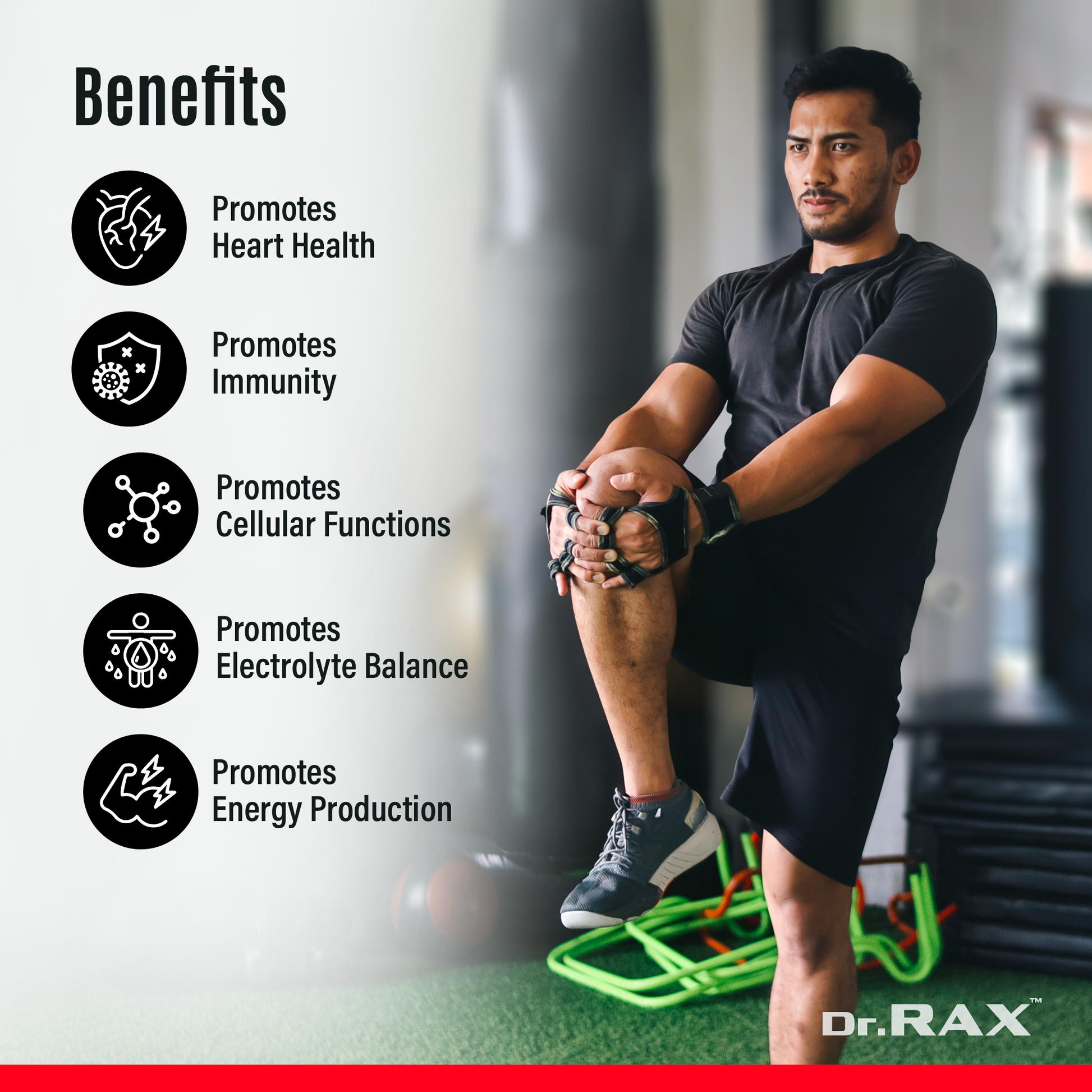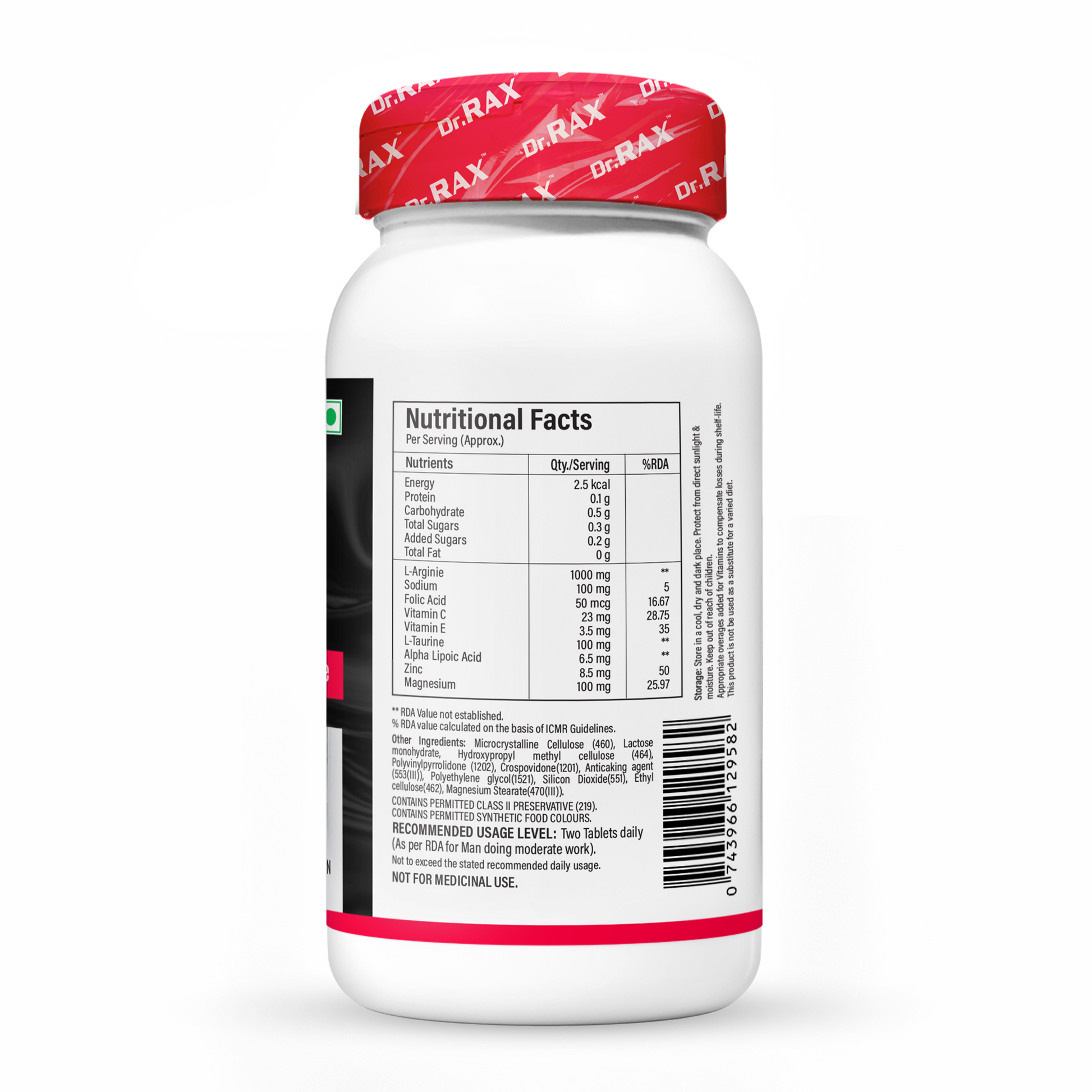 Dr. Rax L-Arginine, Folic Acid & Zinc Veg Tablet is a nutraceutical supplement that can help to support heart health, circulation, immune function, and cellular energy production. L-Arginine, a precursor of nitric oxide, can help improve blood flow and cardiovascular function. Folic acid may contribute to cell renewal, while zinc can support immunity and overall well-being. This advanced formula includes essential micronutrients that may aid in electrolyte balance, antioxidant protection, and muscle endurance. With a carefully curated blend of ingredients, this supplement can help in maintaining energy levels, muscle function, and optimal cellular health.- L-Arginine 1000 mg